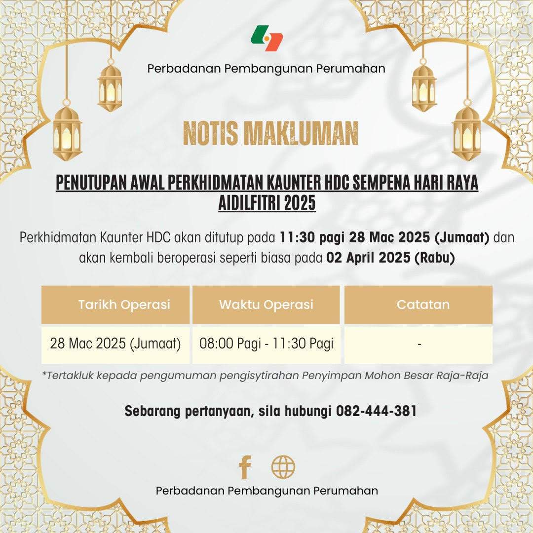 Penutupan Perkhidmatan Kaunter HDC sempena Hari Raya Aidilfitri 2025