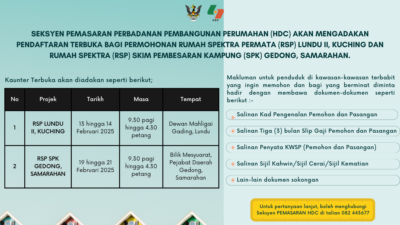 PENDAFTARAN TERBUKA BAGI PERMOHONAN RUMAH SPEKTRA PERMATA (RSP) LUNDU II, KUCHING DAN RUMAH SPEKTRA (RSP) SKIM PEMBESARAN KAMPUNG (SPK) GEDONG, SAMARAHAN